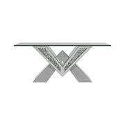 This mirrored coffee table serves as a stunning centerpiece with its bold design. The V-shaped base showcases mirrored panels and sparkling crystal accents for an opulent look. The rectangular, beveled tempered glass top adds elegance and practicality, making this table ideal for entertaining or displaying decor. A striking blend of luxury and modern aesthetics, it elevates any living space.