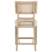 Elevate your dining experience with this stylish counter-height chair, combining natural beauty and modern comfort. Crafted from solid wood, this chair features a hand-woven radio weave cane backrest that adds a light and airy feel to your space. The foam seat cushion, upholstered in soft beige fabric, ensures comfort while dining or entertaining. Designed with clean lines and sturdy construction, this counter-height chair also includes a footrest with a brass-finished metal kick plate for added durability. Perfect for pairing with your counter-height dining table or kitchen island, this chair blends timeless elegance with practical functionality.