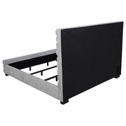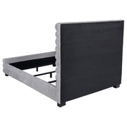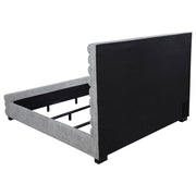Elevate your bedroom with this modern bed featuring a striking 58-inch tall channel-tufted headboard and matching footboard. Upholstered in soft grey boucle fabric, its textured design creates a cozy and inviting ambiance. Built with durable birch, plywood, and engineered wood, this bed ensures long-lasting support. Foam padding enhances comfort, while black-finished legs provide stability and subtle contrast, making it a perfect statement piece for contemporary spaces.