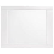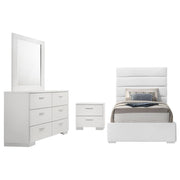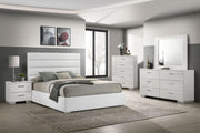 Upgrade your bedroom with this ultra-modern platform bed and matching case pieces. The bed features a sleek white faux leather upholstery with horizontal channel tufting, while its low-profile design enhances the contemporary aesthetic. Case pieces are finished in a polished white high-gloss polyurethane for a clean, sophisticated look. Polished chrome metal bar handles provide a sleek contrast, while spacious drawers with felt-lined top sections offer both style and functionality.