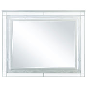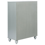 This contemporary 4-piece bedroom set featuring a bed, nightstand, dresser, and mirror imparts a glamorous look and feel to any modern home. Each piece of this exclusive Coaster design comes in a shimmering silver metallic finish that enlivens any space. The imposing bed headboard is upholstered with metallic leatherette that's fully tufted with crystal buttons. The headboard and mirror include white LED touch lighting for a vibrant ambiance, while the nightstand features USB ports. The drawers on each case good are crafted with fret work detail on the front panels and crystal-like pulls, with top drawers lined with black felt to protect your valuables.