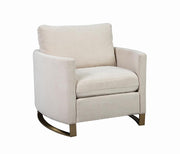 You'll enjoy optimal comfort when you sink into the lush materials of this cozy armchair. It's decadently crafted with kiln-dried solid pine wood, velvet, and foam. The chair also features accent pillows and reversible cushioned feather blend seat backs that you'll never want to leave. A stunning beige fabric upholstery and stainless steel legs with lustrous gold accents add further style. This cozy accent piece will become a family favorite in your living room or den.