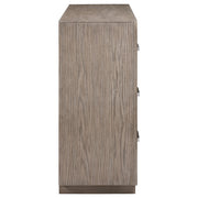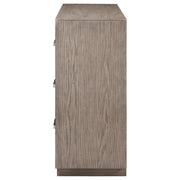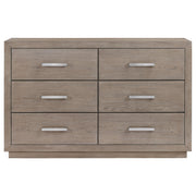 Enjoy the roomy storage and understated character of a modern six-drawer dresser. It's a fresh, understated design that showcases a wide top and recessed base that pair to deliver a timeless look. The dresser shows off wood grain details in a neutral barley brown finish, delivering stylish flair that complements in any setting. Each drawer is equally sized for easy storage and organization. Chrome finish bar pulls add a touch of contrast and textural appeal.