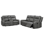 Merging the classic style of both contemporary and transitional design schemes, the two-piece sofa and loveseat set creates a dreamy venue for relaxing. The trending look of smooth grey leatherette upholstery with vertical topstitching delivers decorative elements and a dimensional impact. This motion-reclining set features foam padding on its frames and pocket coil spring seat cushions, as attached back cushions are capped with ultra-plump headrests. Recline into varying positions using a manual control function, and enjoy space efficiency with its wall-hugger design. Bonus features include a center-mounted loveseat console with a flip-top storage bin and a pair of handy beverage holders.