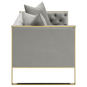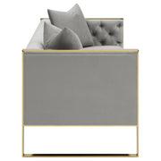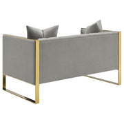 Elegant above all, this three-piece living room set comes with a sofa, loveseat, and armchair that lend a Hollywood Regency flair. Wrapped in a soft and light grey velvet upholstery, each piece is supported by thin stainless steel braces in a polished, high-gloss gold finish. Each furniture piece also offers a shelter style backrest and arms, as well as button tufted interiors. In addition, each tightly wrapped cushion has a smooth waterfall style bench. Included in this set are four matching accent pillows, two each for the sofa and loveseat.