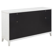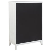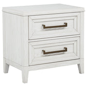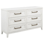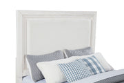 Distinctive hardware and layered trim work create a refined but dimensional effect for a five-piece modern bedroom set. In distressed white with wood grain texturing, it's a complete set that includes an upholstered bed with a padded headboard, two-drawer nightstand, five-drawer chest, and six-drawer dresser and mirror. It delivers ample storage and easy organization in a cohesive bedroom ensemble. The bed features a contemporary, open silhouette with a tall headboard and low footboard. Add colorful linens for a fresh look or stick with crisp white for a soothing monochromatic effect.